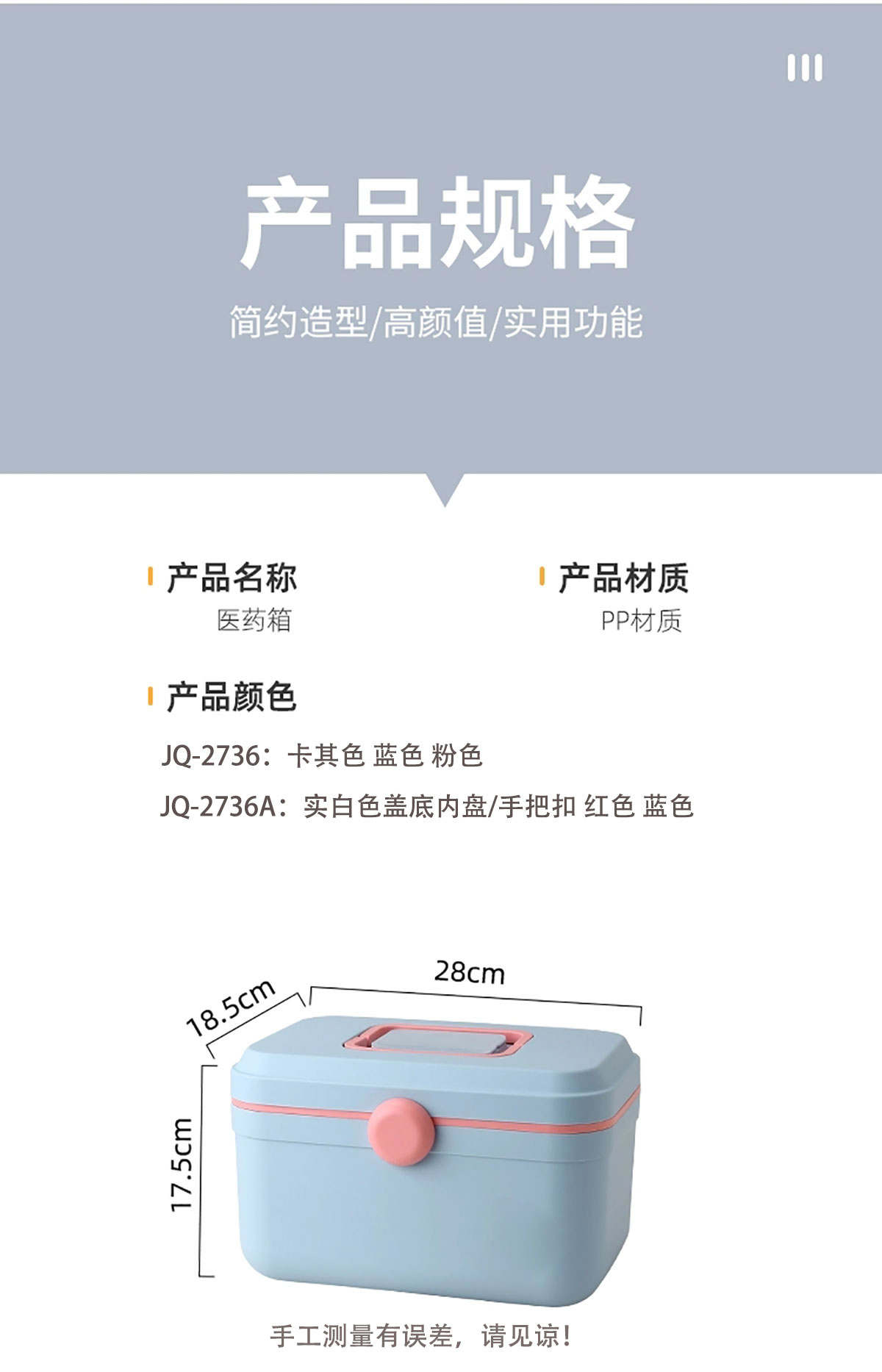 Remarks:JQ-2736:卡其色 粉色 藍(lán)色 JQ-2736A:實(shí)白色蓋底內(nèi)盤(pán)/手把扣 紅色 藍(lán)色