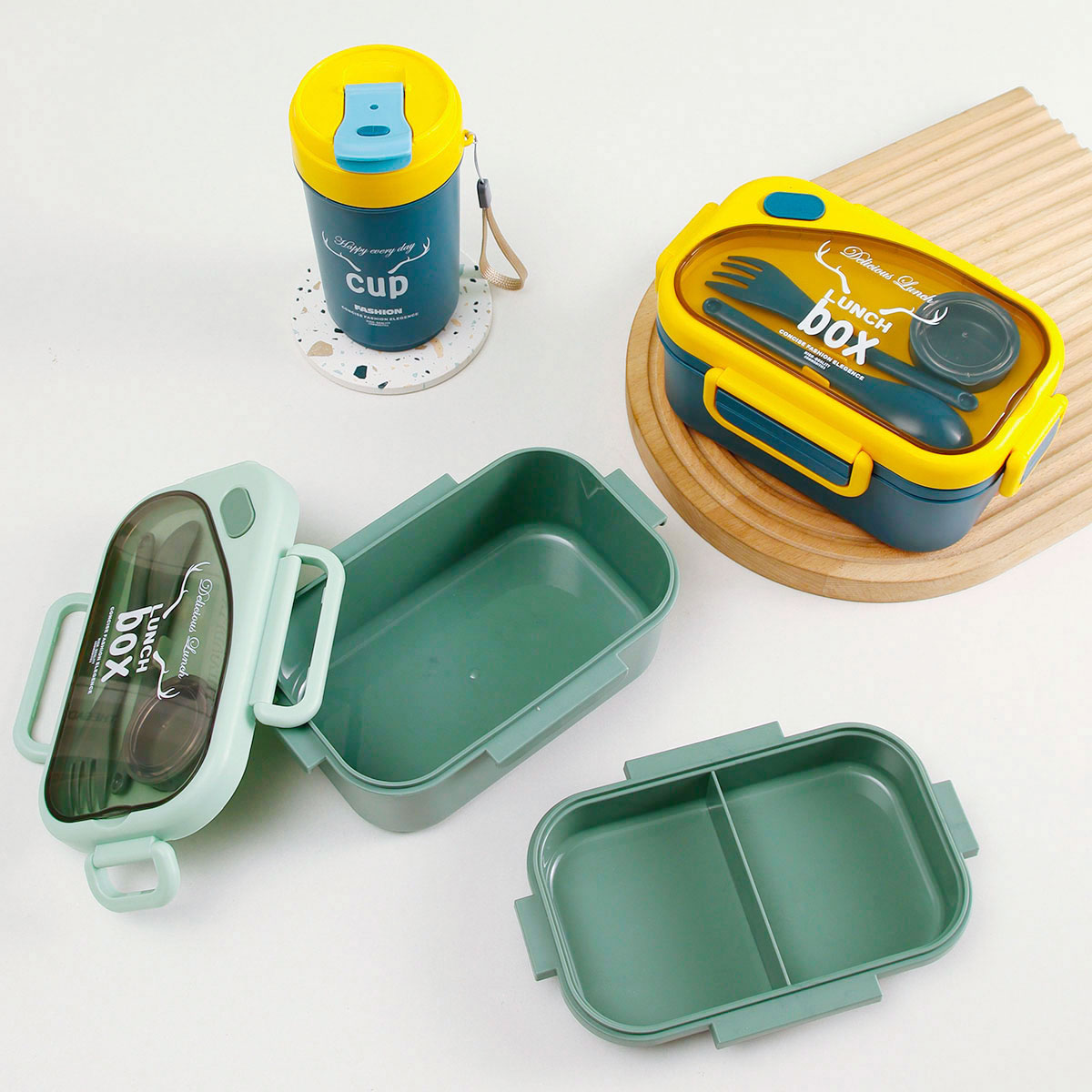 品悅長方雙層密封飯盒(1100ml)(含醬料盒)+圓形/八角隨行杯(500ml)