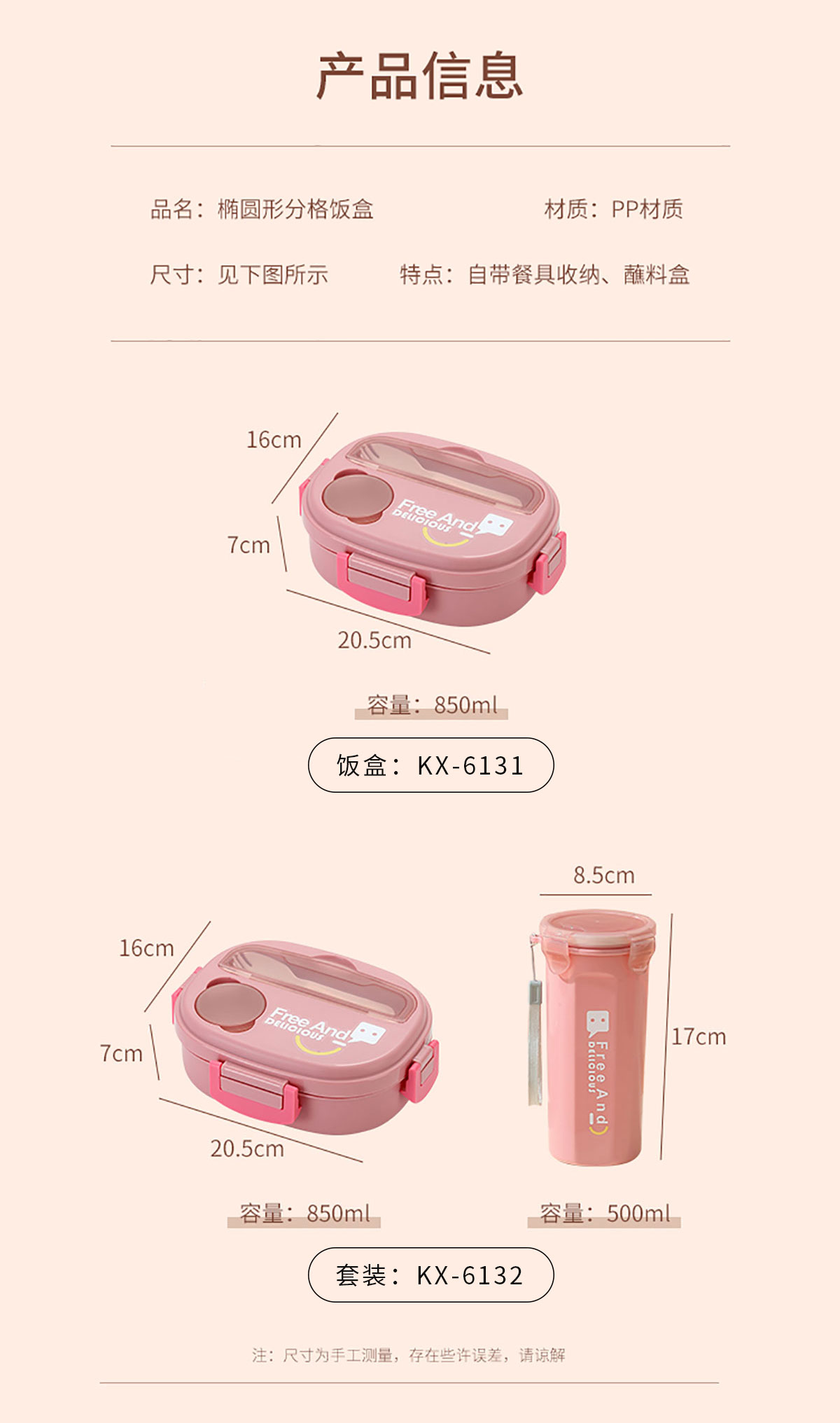 Size: KX-6131:205*160*70mm/850ml KX-6132:飯盒:205*160*70mm/850ml 水壺:Φ85*170mm/500ml