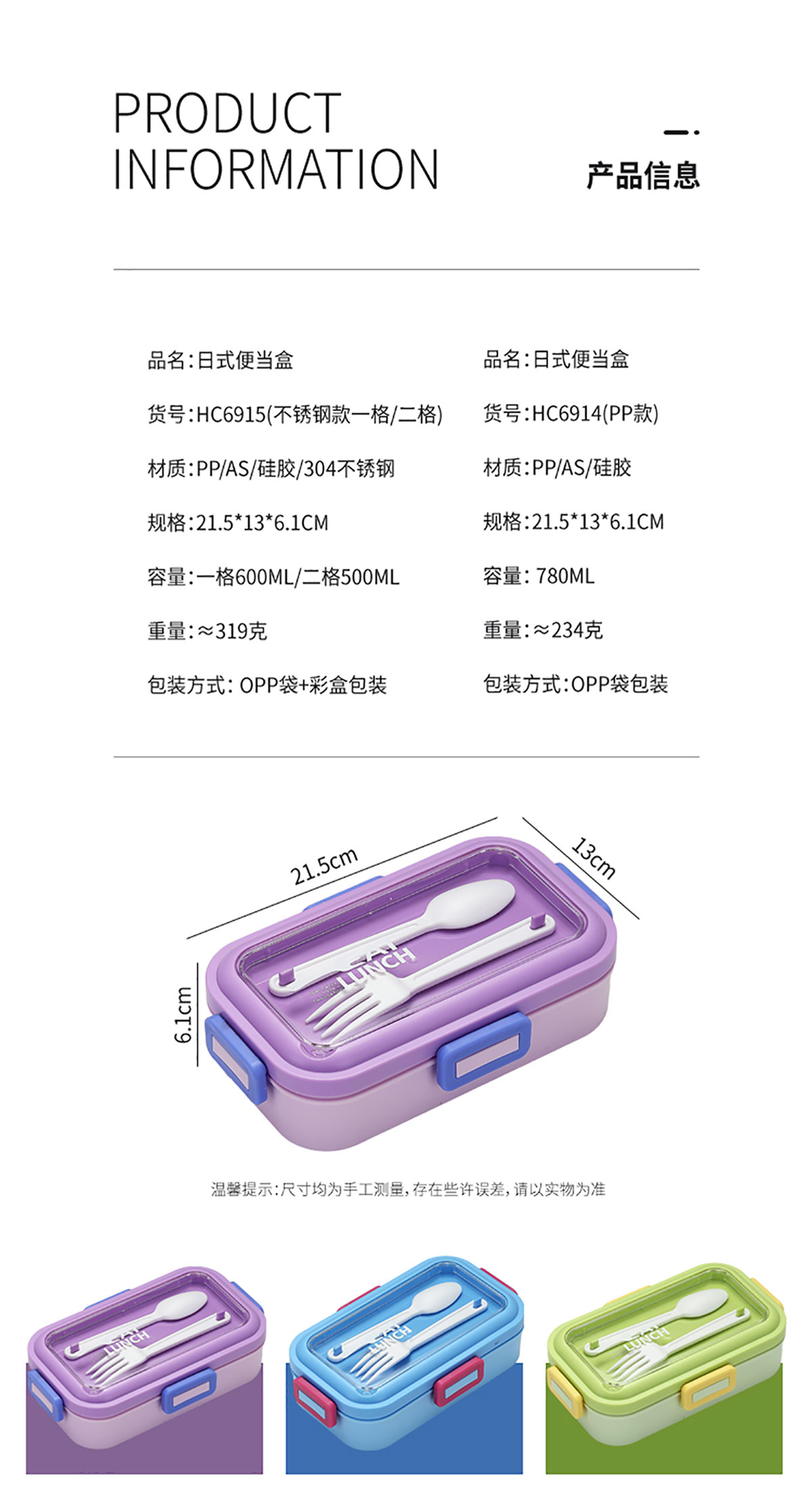 Size: SWY-HC6914(PP款二格):215*130*61mm/780ml